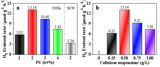 圖4.(a)CNNs樣品在不同Pt負(fù)載量條件下光催化重整纖維素制氫的平均速率;(b)CNNs樣品在在不同纖維素濃度條件下光催化重整纖維素制氫的平均速率