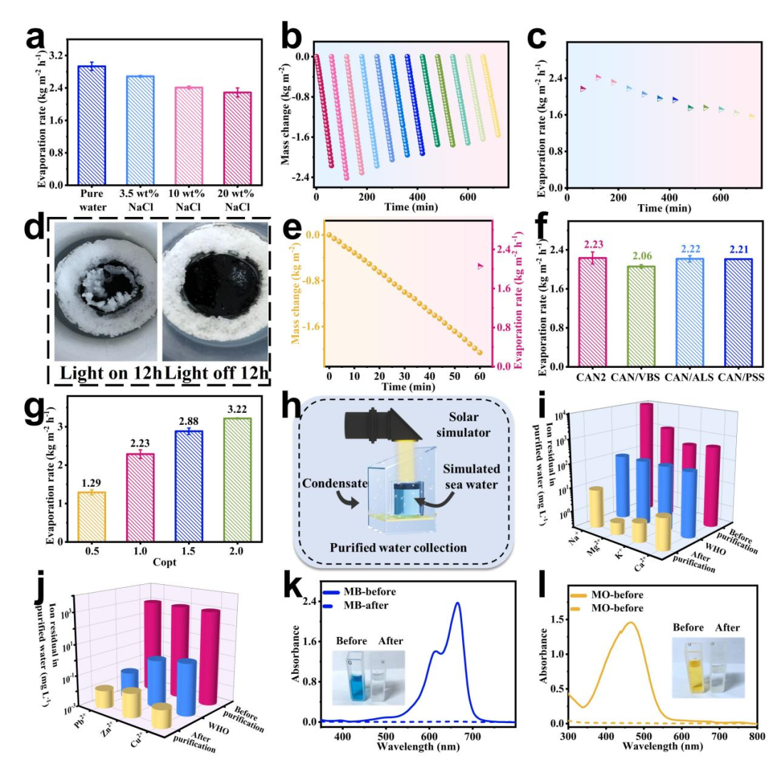 圖5:(a)不同濃度鹽水中的蒸發(fā)速率。(b)CAN2的質(zhì)量損失在連續(xù)12 h光照時。(c)CAN2的蒸發(fā)速率在連續(xù)12 h光照時。(d)光照12h后和關(guān)燈12h后的蒸發(fā)器表面圖片。(e)蒸發(fā)速率和質(zhì)量損失在關(guān)燈12h后繼續(xù)進(jìn)行的蒸發(fā)實驗。(f)CAN2,CAN/VBS,CAN/SAF,CAN/PSS的蒸發(fā)速率。(g)CAN2的蒸發(fā)速率在不同光照強(qiáng)度時。(h)蒸發(fā)水收集裝置。(i)離子濃度的改變在凈水前后。(j)重金屬離子濃度的改變在凈水前后。(k)亞甲基藍(lán)濃度的改變在凈水前后。(l)甲基橙濃度的改變在凈水前后。