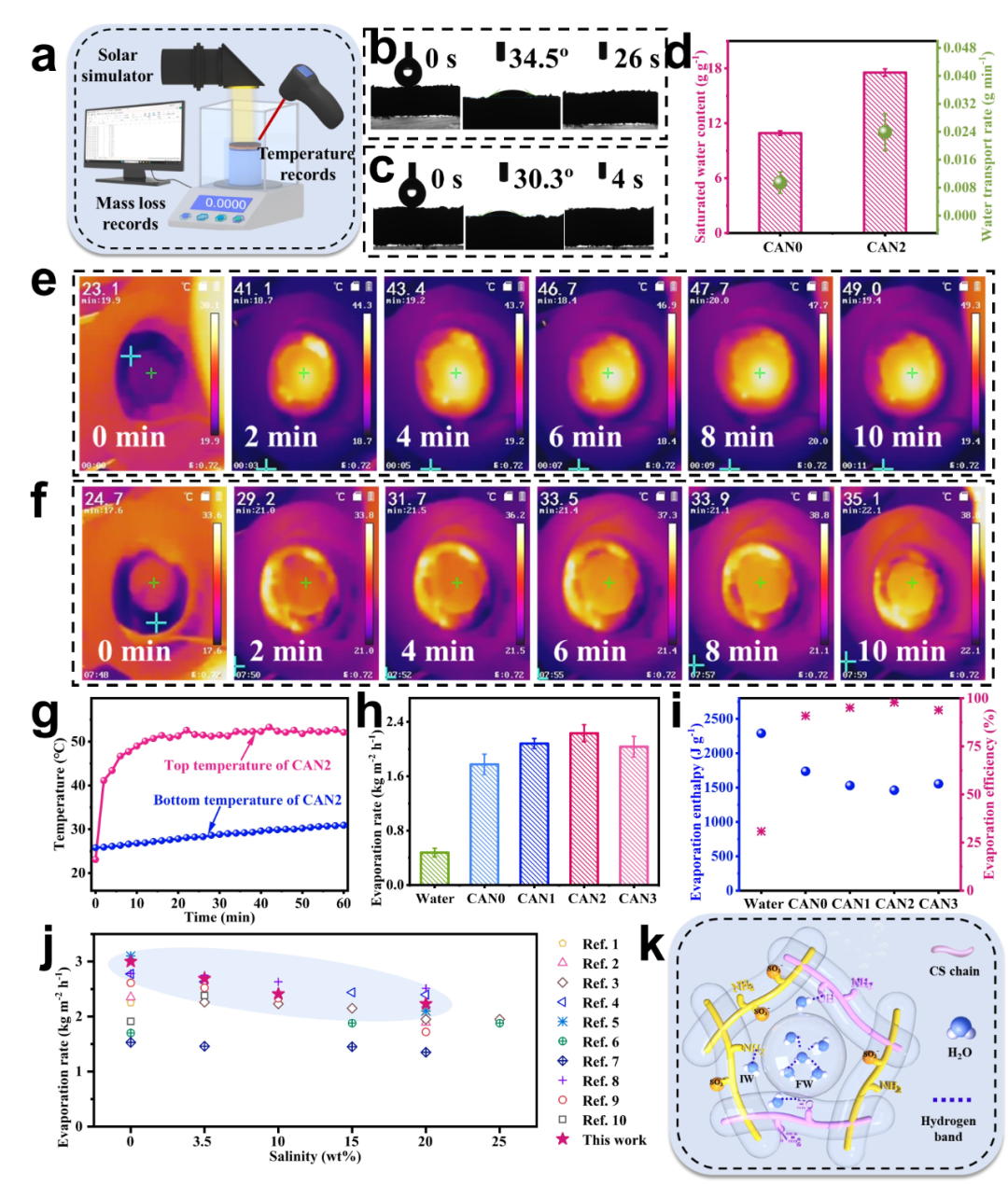圖4:(a)室內(nèi)蒸發(fā)實驗裝置圖。水凝膠的水接觸角圖:(b-c)CAN0和CAN2。(d)CAN0和CAN2的飽和水含量和水運輸速率。(e)CAN2的紅外圖片(f) 未添加Ti3C2Tx的CAN2 的紅外圖片。(g)CAN2的頂層和底層溫度。(h)蒸發(fā)速率。(i)蒸發(fā)焓和蒸發(fā)效率。(j)不同鹽度時的蒸發(fā)速率在以前所作的工作中。(k)蒸發(fā)焓降低的原理。