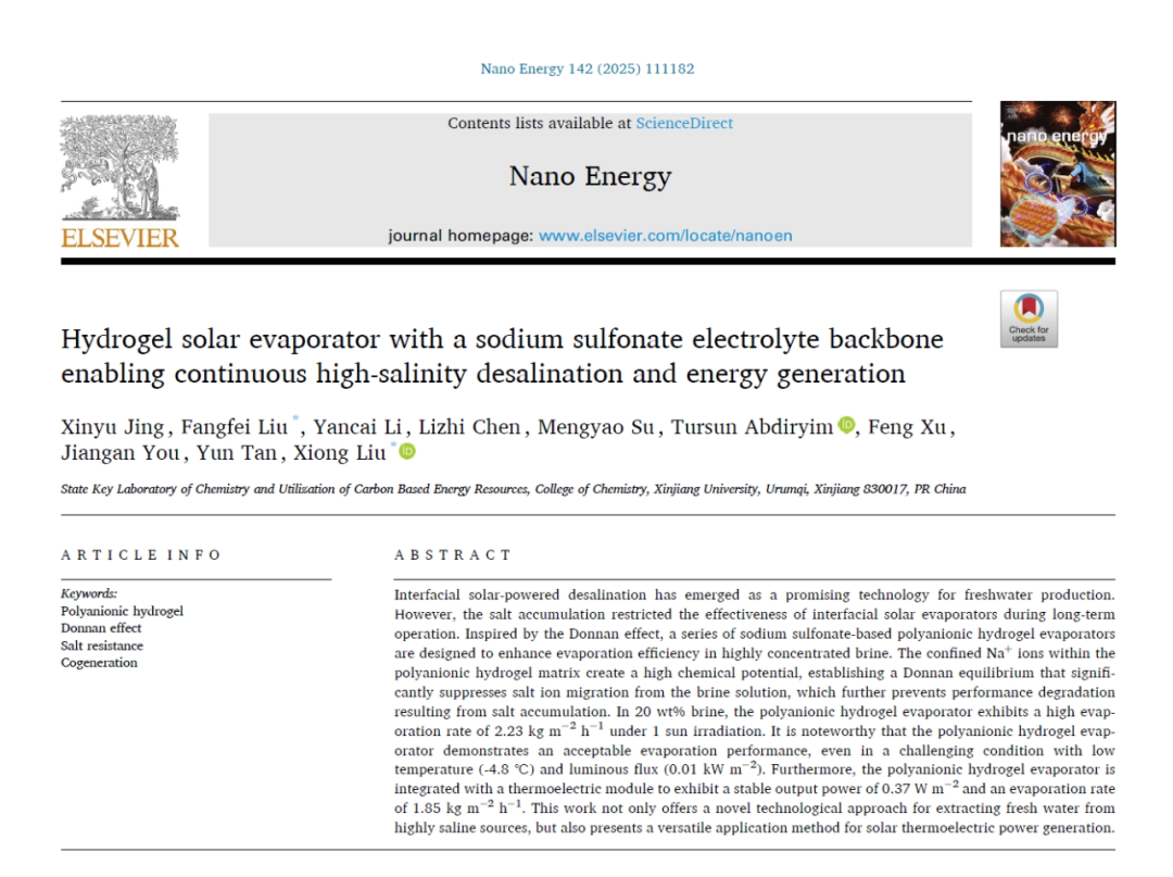 標(biāo)題:Hydrogel solar evaporator with a sodium sulfonate electrolyte backbone enabling continuous high-salinity desalination and energy generation