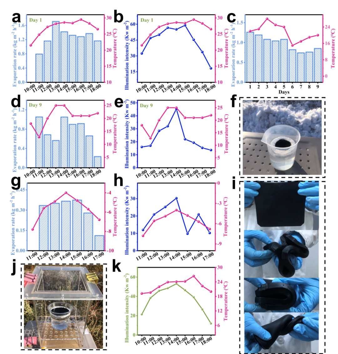 圖6:室外第一天蒸發(fā)實驗:(a)蒸發(fā)速率,(b)光照強(qiáng)度和溫度。(c)室外長循環(huán)實驗。室外第九天蒸發(fā)實驗:(d)蒸發(fā)速率,(e)光照強(qiáng)度和溫度。(f)低溫測試環(huán)境圖片。低溫環(huán)境蒸發(fā)實驗:(g)蒸發(fā)速率,(h)光照強(qiáng)度和溫度。(i)CAN2水凝膠樣品、擠壓、折疊和扭曲圖片。(j)室外蒸發(fā)和蒸餾水收集裝置。(k)光照強(qiáng)度和溫度曲線。
