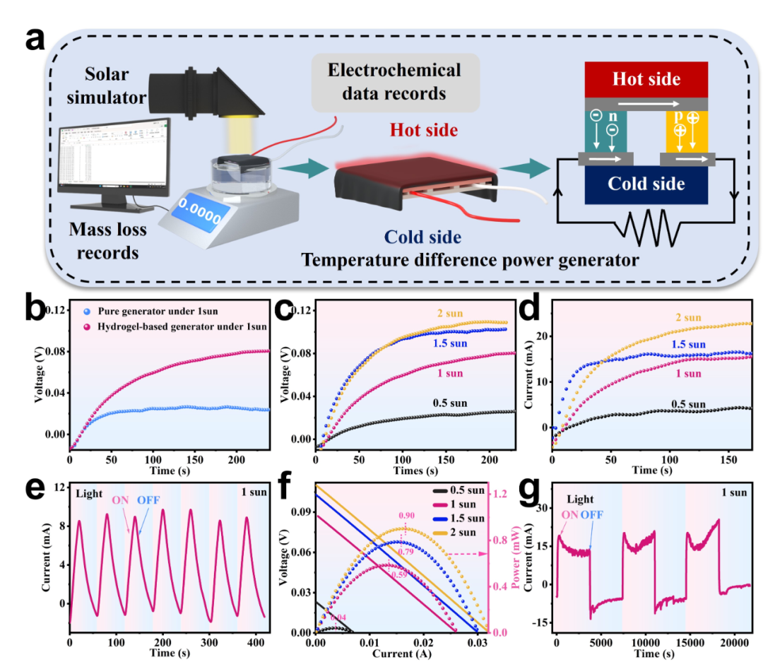 圖8:(a)熱電聯(lián)產(chǎn)裝置示意圖與溫差發(fā)電原理示意圖。(b)Voc的變化。(c)不同光照條件時Voc。(d)不同光照條件的Isc。(e)1太陽光照時Isc。(f)不同光照條件下的功率和功率密度。(g)CAN2水凝膠在1太陽光照時Isc。