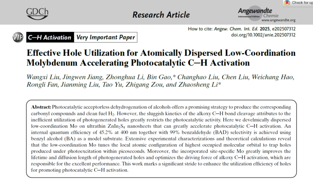 光催化醇無受體脫氫反應為制備羰基化合物和清潔燃料氫氣提供了可行策略。然而,烷氧基C–H鍵斷裂的緩慢動力學導致光生空穴利用率低下,嚴重制約了催化活性。本研究在超薄ZnIn2S4納米片上構建原子級分散的低配位鉬活性位點,可大幅加速光催化C–H鍵活化。以苯甲醇為模型底物時,在400 nm波長下實現(xiàn)45.2%的內(nèi)量子效率,苯甲醛選擇性高達99%。系統(tǒng)的實驗表征與理論計算表明:低配位鉬通過調(diào)控最高占據(jù)分子軌道的局域原子構型,可在皮秒級時間內(nèi)捕獲光激發(fā)產(chǎn)生的空穴;同時,該特異性鉬位點顯著延長了光生空穴壽命及擴散距離,并優(yōu)化了烷氧基C–H鍵活化的驅(qū)動力,從而獲得卓越的催化性能。該工作為提升空穴利用效率以促進光催化C–H鍵活化做出了重要突破。