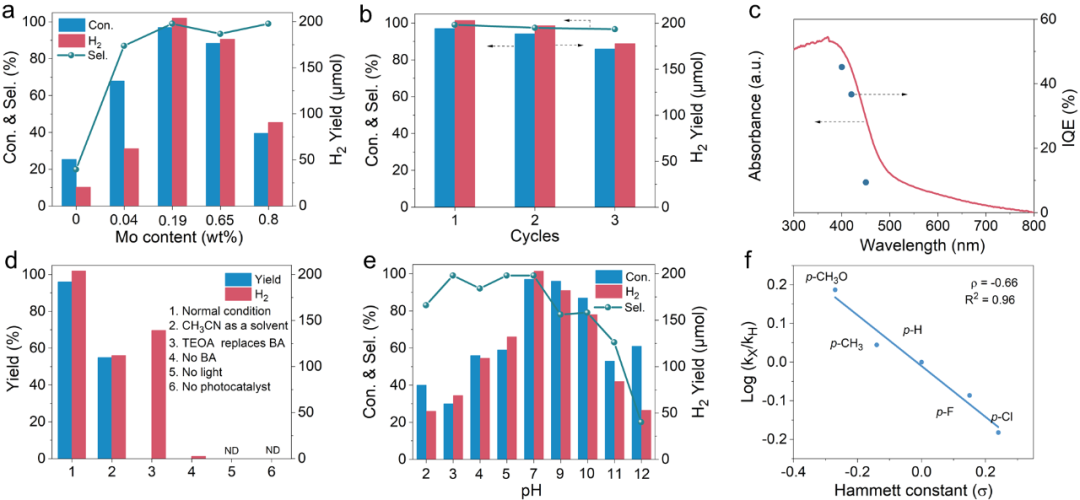 隨后,作者進行苯甲醇脫氫苯甲醇無受體脫氫反應性能測試(圖2a)。在ZnIn2S4上,主要生成的是C–C偶聯(lián)產(chǎn)物氫化安息香,對苯甲醛的選擇性為20%,而且轉(zhuǎn)化率只有25%。在摻入0.19 wt% Mo單原子后,光催化性能明顯得到提升,轉(zhuǎn)化率提高到97%,而且對苯甲醛的選擇性提高到99%。反應在三個循環(huán)后,性能沒有出現(xiàn)明顯降低(圖2b)。Mo1/ZnIn2S4在400 nm處的內(nèi)量子效率達到45.2%,表明催化劑對光生載流子能夠有效利用(圖2c)。作者還探究了溶劑、光照、pH、取代基等對反應的影響(圖2d-f)。