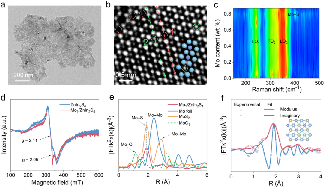 研究內(nèi)容:作者通過Zn空位錨定的方式將低配位Mo單原子分散在超薄的ZnIn2S4納米片上(圖1a,b)。在摻入Mo單原子后,在401 cm?1處出現(xiàn)Mo–S鍵的拉曼峰(圖1c),沒有出現(xiàn)MoS2、MoO2和MoO3的信號,表明沒有引入新相。在低溫EPR圖譜中觀察到,Mo1/ZnIn2S4在g = 2.05處出現(xiàn)Mo5+的信號,表明Mo的價態(tài)為+5價。EXAFS結果顯示,在Mo1/ZnIn2S4樣品中未檢測到明顯的Mo–Mo鍵信號,證實Mo位點以原子級分散形式存在。并且,EXAFS擬合結果顯示Mo–S鍵的配位數(shù)為4,說明Mo具有低配位的特性。