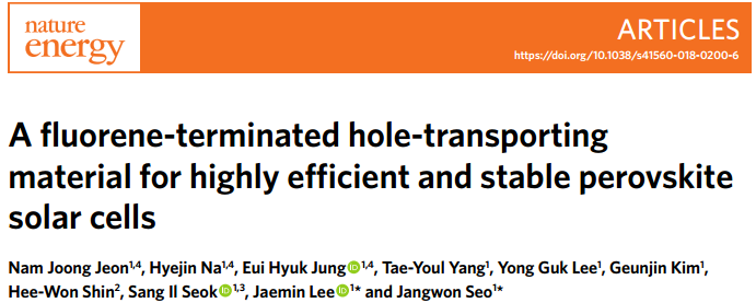 Jeon N J, Na H, Jung E H, et al. A fluorene-terminated hole-transporting material for highly efficient and stable perovskite solar cells[J]. Nature Energy, 2018: 1.