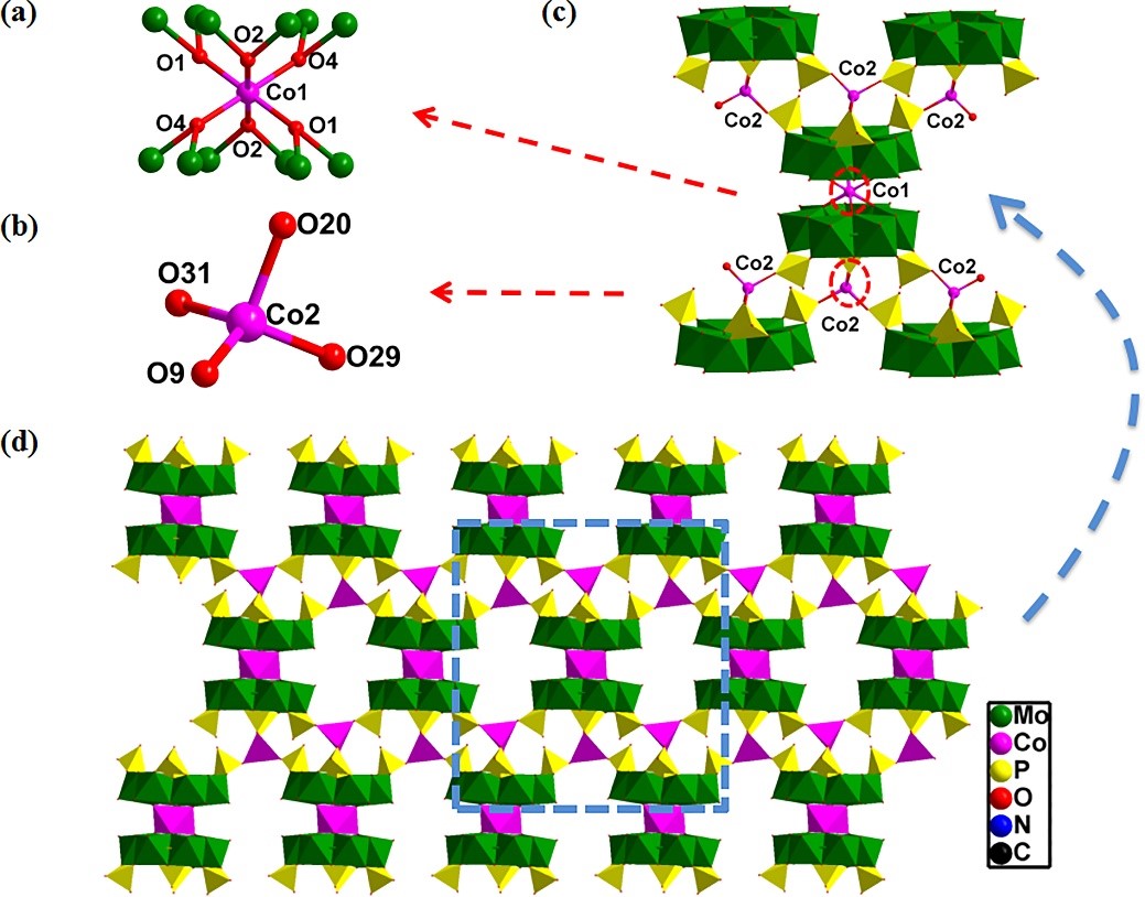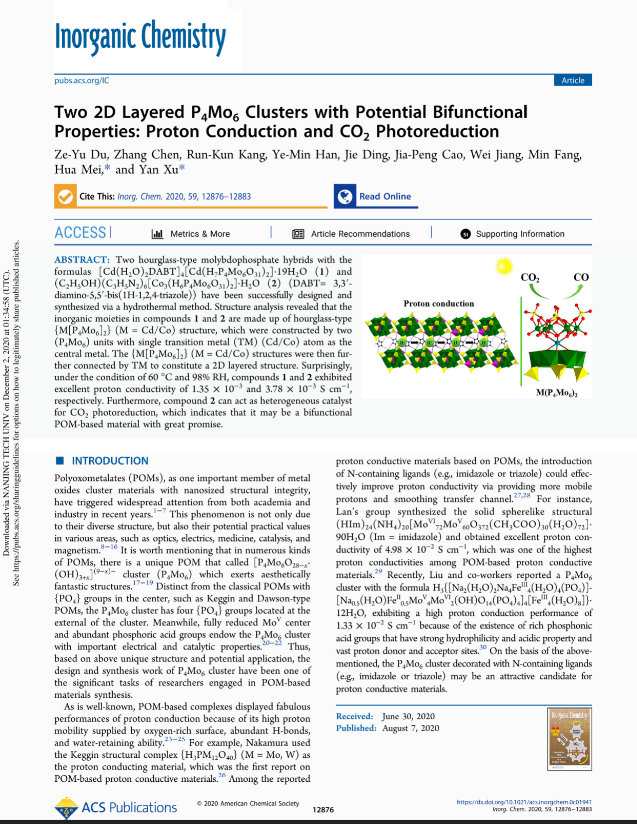 文章簡介:本文采用水熱法成功設(shè)計合成出了兩種沙漏型的磷鉬雜多酸配合物,其分子式分別為 [Cd(H2O)2DABT]4[Cd(H7P4Mo6O31)2]·19H2O(1)和(C2H5OH)(C3H5N2)6[Co3(H6P4Mo6O31)2]·H2O(2)。結(jié)構(gòu)分析表明,配合物1和2的無機部分是由兩個過渡金屬(Cd/Co)原子作為中心的P4Mo6簇構(gòu)成的沙漏型{M[P4Mo6]2}(M=Cd/Co)二聚體。而{M[P4Mo6]2}簇通過過渡金屬連接,進一步形成有趣的二維層狀結(jié)構(gòu)。令人欣喜的是,在60°C和98%相對濕度的條件下,化合物1和2表現(xiàn)出優(yōu)異的質(zhì)子導(dǎo)電性能,其質(zhì)子導(dǎo)電率分別為1.35×10?3和3.78×10?3 S cm?1。同時,化合物2表現(xiàn)出優(yōu)異的CO2光還原性能,在光照8小時的條件下,CO產(chǎn)率達到5789 μmol g?1,表明化合物2具有成為雙功能多酸基材料的潛質(zhì)。https://pubs.acs.org/doi/10.1021/acs.inorgchem.0c01941