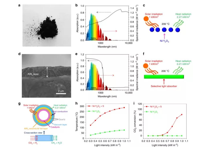 河北大學(xué)的李亞光、王淑芳和浙江師范大學(xué)的胡勇、日本國立物質(zhì)材料研究所葉金花(共同通訊作者)得益于添加可以同時吸收太陽光全譜和產(chǎn)生熱輻射的選擇性光吸收劑,制造了新型光熱轉(zhuǎn)換器件,可以吸收95%的太陽光,熱輻射僅為報道吸光材料的1/10,能夠在標(biāo)準(zhǔn)太陽光輻照下產(chǎn)生288 °C的高溫,是傳統(tǒng)吸光材料的三倍以上,可實現(xiàn)標(biāo)準(zhǔn)太陽光驅(qū)動下的二氧化碳甲烷化光熱化。不僅如此,他們還制備了負(fù)載單原子鎳的非晶Y2O3二維納米片,作為高效甲烷化催化劑。在選擇性吸光劑光熱器件和負(fù)載型非晶Y2O3二維納米片的協(xié)同作用下,實現(xiàn)了室外太陽光(0.52到0.7個標(biāo)準(zhǔn)太陽光強(qiáng)度)輻照的高效二氧化碳甲烷化,其轉(zhuǎn)化效率和甲烷產(chǎn)率可分別達(dá)到80%和7.5 l m?2 h?1。