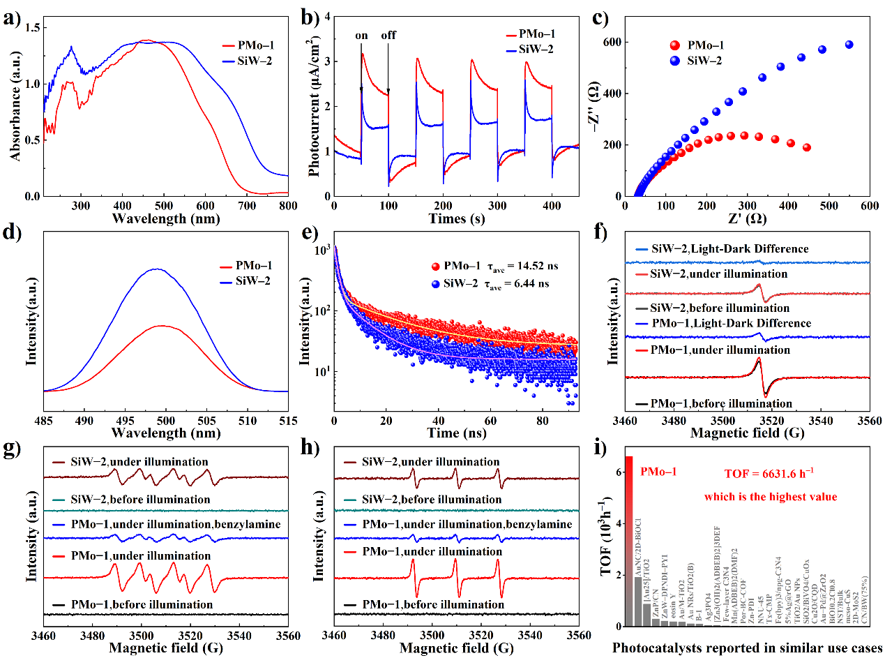 圖文解析 新能源的開發(fā),如太陽能、風(fēng)能、潮汐能、地?zé)崮艿龋趲椭鷮?shí)現(xiàn)“碳中和”的全球目標(biāo)。光催化作為一種有前途的太陽能利用方式,已經(jīng)引起了廣泛關(guān)注。然而,其潛在的缺點(diǎn),如低的陽光利用效率和高的載流子的復(fù)合率,嚴(yán)重限制了其整體的能量轉(zhuǎn)換效率,并進(jìn)一步擠壓了其實(shí)際應(yīng)用。因此,開發(fā)具有增強(qiáng)光催化性能的可見光響應(yīng)光催化劑已經(jīng)成為一個(gè)研究熱點(diǎn)。 另一方面,亞胺及其衍生物是合成藥品、染料和精細(xì)化學(xué)品等的重要中間體。在光照下,芐胺與O2的光催化氧化偶聯(lián)具有高原子經(jīng)濟(jì)性和環(huán)境友好性的優(yōu)勢(shì)。近年來,各種光催化劑已經(jīng)被開發(fā)出來以實(shí)現(xiàn)這一反應(yīng)。盡管它們表現(xiàn)出較高的光催化活性,但同時(shí)也存在一些問題,如結(jié)構(gòu)不清晰、反應(yīng)時(shí)間長(zhǎng)和催化劑難以回收等。因此,開發(fā)高效和可重復(fù)使用的光催化劑來實(shí)現(xiàn)亞胺合成仍然是一項(xiàng)非常有價(jià)值的任務(wù)。 在此,我們合成了兩例POMOFs結(jié)晶型光催化劑(PMo-1和SiW-2)。X射線單晶衍射分析表明,PMo-1和SiW-2是同構(gòu)的,只是POMs陰離子有所不同。以PMo-1為例,其結(jié)構(gòu)單元由兩個(gè)Cd(II)離子、一個(gè)[PMoVI11MoVO40]4?陰離子、兩個(gè)[Ru(bpy)2(dcbpy)]金屬配體、四個(gè)配位DMF分子和兩個(gè)自由DMF分子組成(圖1)。POMs陰離子通過氫鍵等弱相互作用和Cd-[Ru(bpy)2(dcbpy)]框架相連。這種連接不僅在指導(dǎo)POMOFs合成上發(fā)揮了重要作用,而且還加強(qiáng)了不同組分之間的聯(lián)系,從而改善了電荷轉(zhuǎn)移和電子交換過程,確保了更長(zhǎng)的激發(fā)態(tài)壽命以實(shí)現(xiàn)高反應(yīng)活性。同時(shí),通過XPS進(jìn)一步確定了PMo-1和SiW-2中金屬原子的價(jià)態(tài)。另外,還通過它們的FTIR、PXRD圖譜和TGA曲線進(jìn)一步確認(rèn)了其結(jié)構(gòu)和組成。 圖1 PMo-1的結(jié)構(gòu)描述。a) PMo-1的結(jié)構(gòu)單元。b)一維鏈之間通過π-π堆積沿a軸方向形成的二維結(jié)構(gòu)。c) POMs和一維鏈之間的陰離子···π相互作用(天藍(lán)色虛線)和氫鍵(棕色虛線)。d) PMo-1的3D結(jié)構(gòu)。(顏色代碼:C,灰色-40%;Cd,青綠色;N,藍(lán)色;O,紅色;H,白色;Ru,玫瑰色;Mo和MoO6多面體,藍(lán)綠色;P和PO6多面體,黃色。) PMo-1和SiW-2的固體紫外光譜顯示兩種POMOFs都表現(xiàn)出廣泛的光吸收(圖2a),幾乎覆蓋了整個(gè)紫外-可見光區(qū)。進(jìn)一步計(jì)算得到PMo-1和SiW-2的帶隙(Eg)分別為2.12 eV和2.02 eV,揭示了它們作為光催化劑的潛力。結(jié)合在不同頻率下的Mott?Schottky測(cè)試得到PMo-1和SiW-2的最低未占分子軌道(LUMO)能級(jí)為?0.37 V(vs. NHE)和?0.39 V(vs. NHE),比O2生成O2??的還原電位[E(O2/ O2??)] = ?0.33 V(vs. NHE)更負(fù),為活化O2生成O2??奠定了理論基礎(chǔ)。根據(jù)PMo-1和SiW-2的Eg和LUMO進(jìn)一步計(jì)算出最高占據(jù)分子軌道(HOMO)分別為1.75 V(vs. NHE)和1.63 V(vs. NHE)。顯然,它們的HOMO能級(jí)比芐胺偶聯(lián)所需的氧化電位更正:E1/2(M+/M) = 1.47 V(vs. NHE)。因此,利用PMo-1和SiW-2作為光催化劑來實(shí)現(xiàn)芐胺的氧化偶聯(lián)反應(yīng)在理論上是可行的。 為了更好地了解PMo-1比SiW-2活性高的原因,首先,我們通過瞬態(tài)光電流和電化學(xué)阻抗來研究它們的電子?空穴對(duì)分離和載流子遷移特性。在可見光照射下,PMo-1產(chǎn)生的光電流比SiW-2高得多,這表明PMo-1中的光誘導(dǎo)電子?空穴對(duì)的分離效率更高(圖2b)。同時(shí),Nyquist圖顯示PMo-1具有比SiW-2更小的半圓形尺寸(圖2c),表明其電荷轉(zhuǎn)移電阻更低,電荷轉(zhuǎn)移過程更快,這與光電流響應(yīng)結(jié)果一致。此外,與SiW-2相比,PMo-1的穩(wěn)態(tài)光致發(fā)光光譜強(qiáng)度要低得多,這表明PMo-1的電子?空穴對(duì)復(fù)合概率較低(圖2d)。同時(shí),通過TRPL光譜測(cè)試了PMo-1和SiW-2的特定電荷載體動(dòng)力學(xué)(圖2e)。其中,PMo-1表現(xiàn)出較慢的指數(shù)衰減,平均壽命為14.52 ns,是SiW-2(6.44 ns)的2.3倍,表明PMo-1產(chǎn)生的光生載流子更有可能參與隨后的表面氧化還原反應(yīng),這有利于提高光催化性能。 第三,進(jìn)行了EPR測(cè)試以評(píng)估其產(chǎn)生光生自由基和活性氧(ROS)的能力。PMo-1在光照后顯示出明顯增強(qiáng)的EPR信號(hào),然而SiW-2的EPR信號(hào)沒有表現(xiàn)出明顯的變化,表明PMo-1在光照下能夠比SiW-2產(chǎn)生更多的載流子(圖2f)。此外,在PMo-1的存在下觀察到明顯的O2??和1O2的EPR特征信號(hào)峰(圖2g和圖2h),而在SiW-2中檢測(cè)到的信號(hào)要弱得多,這意味著PMo-1擁有比SiW-2更強(qiáng)的將O2活化為O2??和1O2的能力。 圖2 a) PMo-1和SiW-2的紫外可見漫反射光譜。PMo-1和SiW-2的b)瞬態(tài)光電流響應(yīng)和c) Nyquist圖。PMo-1和SiW-2的d) PL和e) TRPL光譜。f) PMo-1和SiW-2中光生自由基的EPR檢測(cè)。g) 由DMPO捕獲的PMo-1和SiW-2上的O2??生成的EPR檢測(cè)。h)由4-oxo-TEMP 捕獲的PMo-1和SiW-2上的1O2生成的EPR檢測(cè)。i)與在類似實(shí)驗(yàn)條件下報(bào)道的光催化劑的對(duì)比圖。 值得一提的是,PMo-1催化芐胺氧化偶聯(lián)的TOF高達(dá)6631.6 h?1。據(jù)我們所知,PMo-1的TOF超過了在類似實(shí)驗(yàn)條件下以往報(bào)道的任何光催