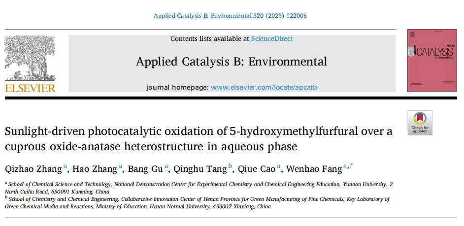 中文標(biāo)題:水相中氧化亞銅-銳鈦礦異質(zhì)結(jié)上太陽光驅(qū)動的5-羥甲基糠醛催化選擇氧化