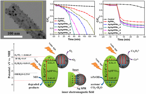 采用固相反應(yīng)和原位光沉積法合成了Ag/AgxH3-xPMo12O40(簡化為Ag / AgHPMo12)納米線。 AgHPMo12納米線的直徑約為45±10nm,Ag納米顆粒(5-15nm)均勻地長在AgHPMo12納米線的表面。通過控制光沉積時間來控制復(fù)合材料中的Ag含量。隨著照射時間的增加,樣品在可見光區(qū)域的光吸收逐漸增強(qiáng)。在可見光(λ> 420nm)照射下,Ag / AgHPMo12-4對甲基橙的降解和Cr2O72-的還原具有顯著的光催化性能。對光催化機(jī)理的研究表明Ag和AgHPMo12都可以被可見光激發(fā)。光誘導(dǎo)的電子從AgHPMo12轉(zhuǎn)移到金屬Ag,并與Ag等離子體孔穴結(jié)合。Ag等離子體電子被O2捕獲以形成·O2-,或直接還原Cr2O72-至Cr3+。同時,MO或i-PrOH被AgHPMo12的產(chǎn)生·O2-物種和光生空穴氧化。Ag/AgxH3-xPMo12O40納米線它們顯示出高效地和可回收的光催化性能,用于去除有機(jī)和無機(jī)污染物。