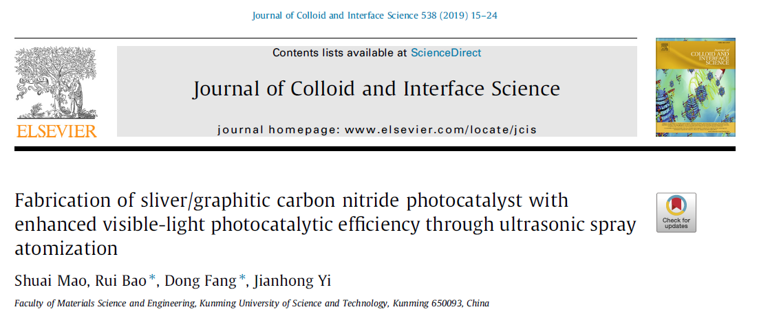 文章信息:Shuai Mao, Rui Bao , Dong Fang , Jianhong Yi. Fabrication of sliver/graphitic carbon nitride photocatalyst with enhanced visible-light photocatalytic efficiency through ultrasonic spray