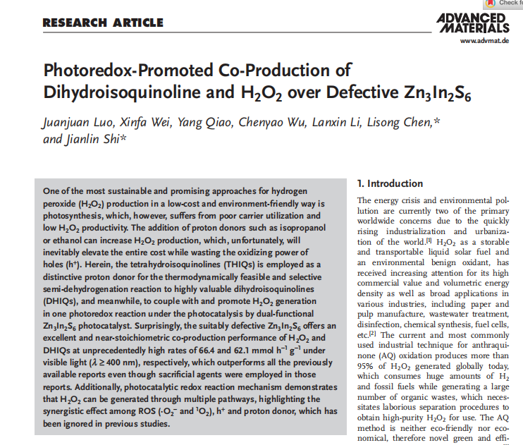 中文標(biāo)題:缺陷Zn3In2S6光氧化還原促進(jìn)二氫異喹啉和H2O2共生產(chǎn)