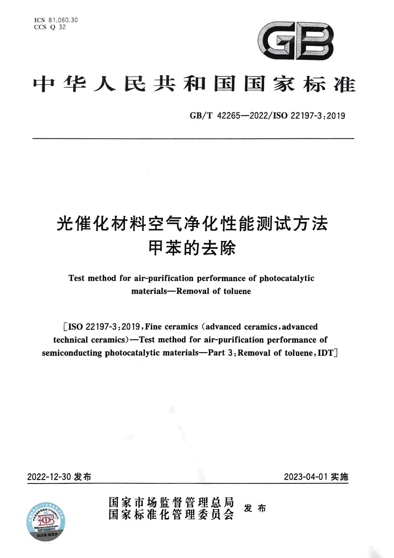 國(guó)家標(biāo)準(zhǔn)《光催化材料空氣凈化性能測(cè)試方法 甲苯的去除》 由TC194(全國(guó)工業(yè)陶瓷標(biāo)準(zhǔn)化技術(shù)委員會(huì))歸口 ,主管部門(mén)為中國(guó)建筑材料聯(lián)合會(huì)。