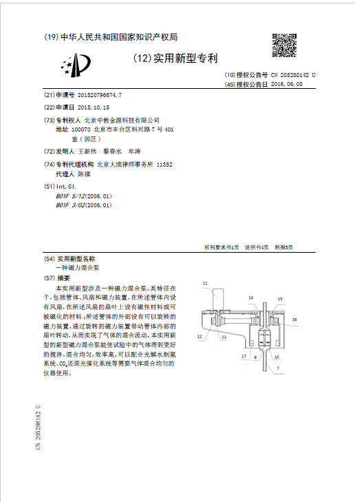本實(shí)用新型涉及一種磁力混合泵,其特征在于,包括管體、風(fēng)扇和磁力裝置,在所述管體內(nèi)設(shè)有風(fēng)扇,在所述風(fēng)扇的扇葉上設(shè)有磁性材料或可被磁化的材料;所述管體的外部設(shè)有可以旋轉(zhuǎn)的磁力裝置,通過旋轉(zhuǎn)的磁力裝置帶動管體內(nèi)部的扇葉轉(zhuǎn)動,從而實(shí)現(xiàn)了氣體的混合流動。本實(shí)用新型的新型磁力混合泵能使試驗(yàn)中的氣體得到更好的攪拌,混合均勻,效率高,可以配合光解水制氫系統(tǒng)、CO2還原光催化系統(tǒng)等需要?dú)怏w混合均勻的儀器使用。