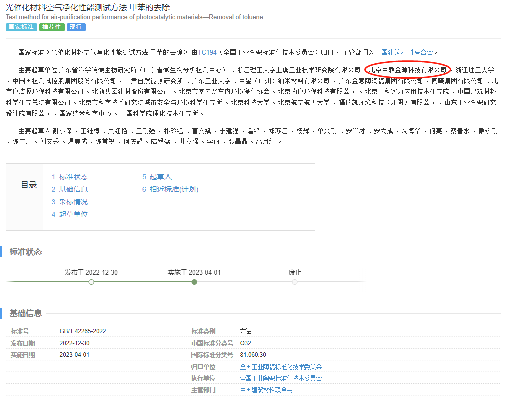 國家標(biāo)準(zhǔn)《光催化材料空氣凈化性能測試方法 甲苯的去除》 由TC194(全國工業(yè)陶瓷標(biāo)準(zhǔn)化技術(shù)委員會)歸口 ,主管部門為中國建筑材料聯(lián)合會。