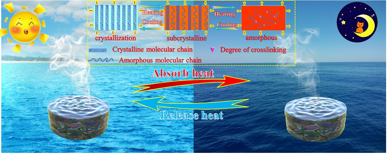 太陽能驅(qū)動的界面蒸發(fā)材料在海水淡化方面應用廣泛。但太陽能有間歇性,為了解決這一問題,研究者將相變材料和界面蒸發(fā)材料結合。許多相變復合材料(PCC)用物理共混法負載在界面蒸發(fā)基體材料中,導致其在在長期的使用中,可能存在泄漏問題,造成水的二次污染的問題。為了解決這些問題,我們開發(fā)了一種新型的界面蒸發(fā)材料,可在間歇性太陽光照射下連續(xù)高效蒸發(fā)清潔水。將相變材料(PCM)月桂酸(LA)和氧化石墨烯(GO)化學接枝,聚乙烯醇(PVA)修飾基體材料細菌纖微素(BC),得到固-固相變材料(以下簡稱BC/PVA/GO-g-LA-SSPCMs)。