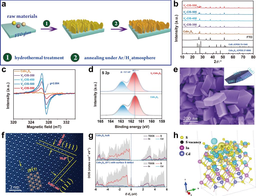 基于此,在陳代榮教授的指導下,課題組首先合成了晶體結構穩(wěn)定且中心金屬d電子易于調控的三元金屬硫化物CdIn2S4。然后通過簡單的還原性氣氛處理的策略,成功在CdIn2S4表面引入硫空位。通過電子順磁譜及球差電鏡表征確認了表面硫空位的存在。光電催化水分解性能表明具有硫空位的CdIn2S4光電陽極在1.23V (vs. RHE)外置偏壓和模擬太陽光下,獲得了5.73?mA?cm-2的光電流密度,是目前報道的金屬硫化物基單光子吸收體的最大值。同時,課題組在硫空位對PEC性能和電荷轉移動力學的影響上進行了系統(tǒng)地研究。實驗和理論計算表明,表面硫空位除能有效提高界面載流子濃度、增大光電陽極/電解質能帶彎曲外,可以有效抑制CdIn2S4光陽極上的表面態(tài)分布,這也是獲得高光電流密度的本質原因。該工作為調節(jié)半導體/電解質界面電位提供了一種途徑,也為其他金屬硫化物光電陽極材料的設計提供新思路。