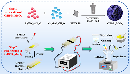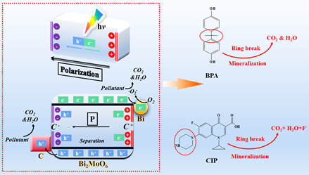 本文受啟發(fā)于極化促進(jìn)體內(nèi)電荷分離,選取具有鐵電性質(zhì)的Bi2MoO6作為合適的改性材料。首先,通過(guò)一步溶劑熱法引入碳層和半金屬Bi,對(duì)Bi2MoO6進(jìn)行傳統(tǒng)方法的改性,光催化降解環(huán)丙沙星(CIP)和雙酚A(BPA)的效率都能得到一定的提升。隨后,通過(guò)對(duì)其簡(jiǎn)便的電極化處理后,我們觀(guān)察到極化后催化劑的降解效率得到大幅度提升。通過(guò)XRD、FT-IR、SEM、TEM、DRS等分析,我們發(fā)現(xiàn)極化前后沒(méi)有明顯地改變催化劑的晶相和化學(xué)鍵組分、微觀(guān)整體形貌、禁帶寬度等。在不明顯改變催化劑的物理和化學(xué)等性質(zhì)的條件下而又能提高光催化性能,這有利于維持催化劑的整體性和穩(wěn)定性。另外,PFM分析證實(shí)了催化劑具有鐵電性質(zhì)和極化切換信號(hào)。最后,通過(guò)分析光催化反應(yīng)的中間產(chǎn)物,我們提出了一種可能的光催化電荷轉(zhuǎn)移機(jī)理,即傳統(tǒng)的改型手段只能促進(jìn)催化劑表面電荷的分離,體內(nèi)電荷會(huì)迅速的復(fù)合,從而限制了催化劑性能的提升。鐵電極化效應(yīng)會(huì)引起催化劑的自發(fā)極化電場(chǎng),因而能夠促進(jìn)體內(nèi)電荷的分離。我們聯(lián)用傳統(tǒng)方法(碳層和半金屬Bi的引入)和鐵電極化效應(yīng)共同地修飾催化劑,促進(jìn)其表面和體內(nèi)電荷的分離,使得催化劑的光催化性能得到明顯提升。