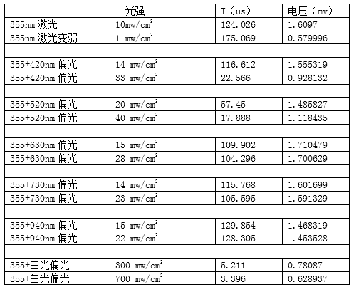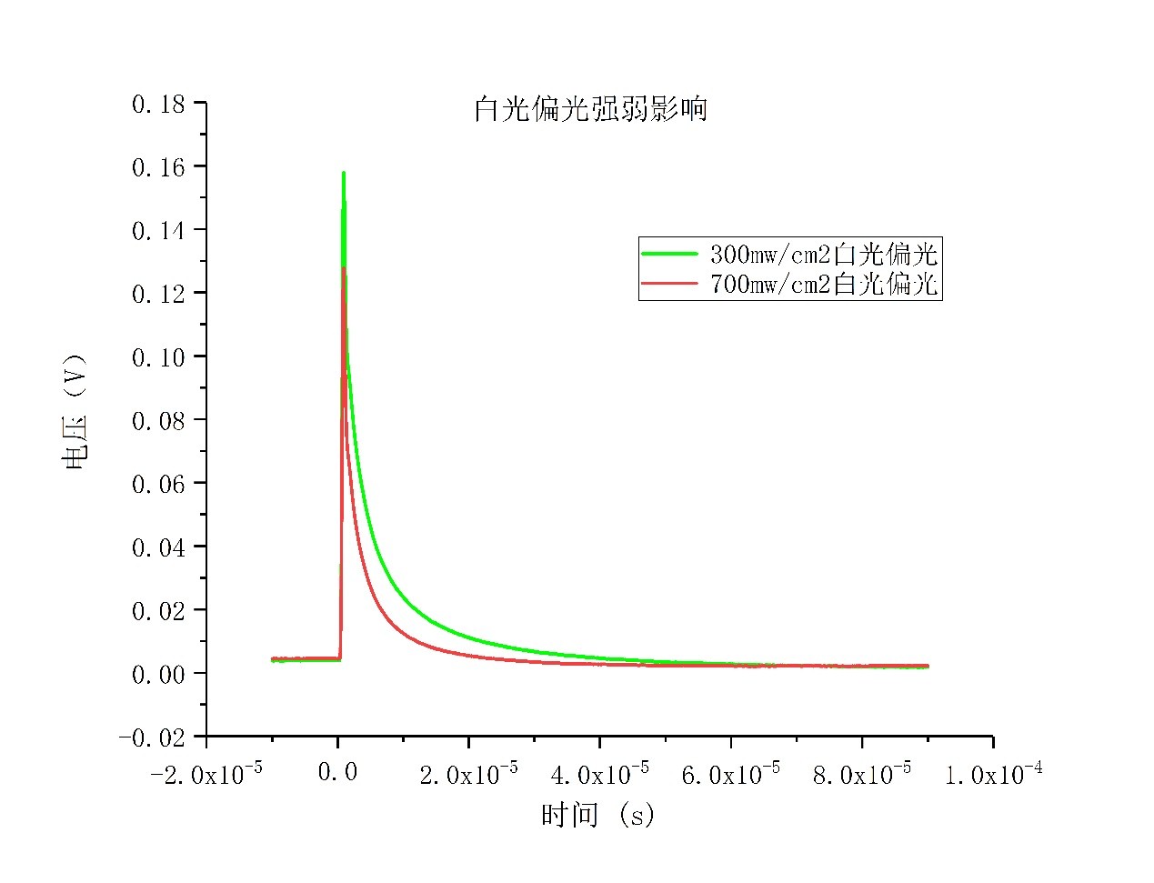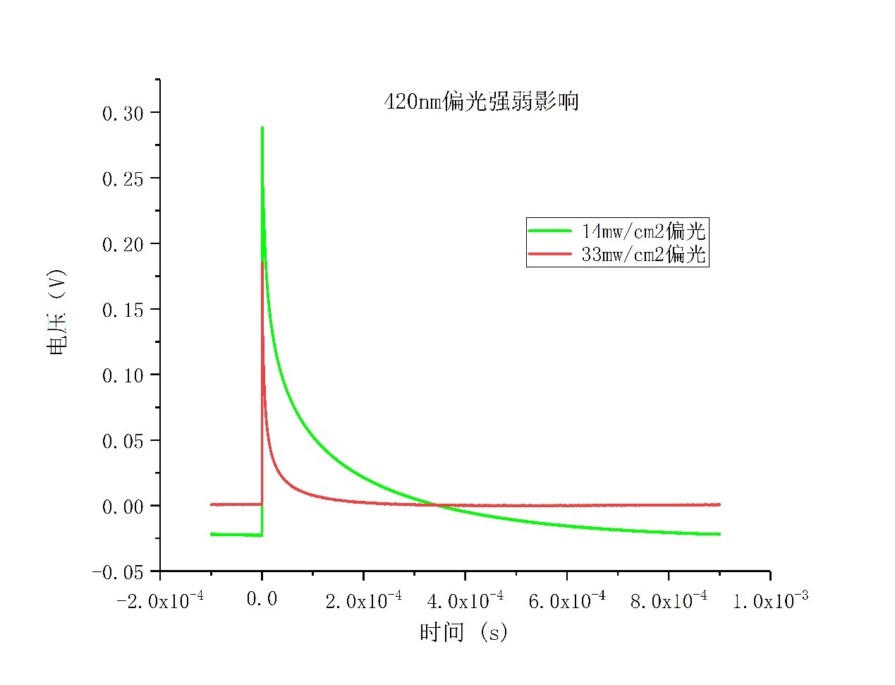 與穩(wěn)態(tài)光電壓對比,CdS粉末樣品響應(yīng)波段為300nm-600nm,我們可以得知,當(dāng)有樣品響應(yīng)波段的偏光照射時(shí),光強(qiáng)越強(qiáng)TPV壽命越小,峰值越小。但是如果樣品對偏光沒有響應(yīng)時(shí),則TPV信號不受偏光影響。