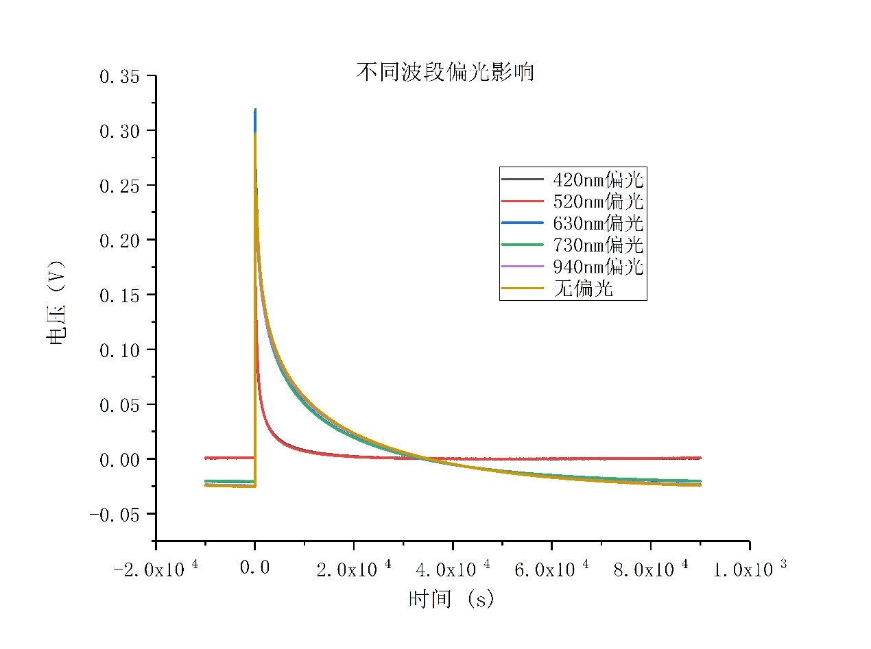 將不同波段偏光情況下TPV信號與無偏光TPV信號比對,420nm、520nm偏光時(shí)TPV信號壽命減小,630nm、730nm、940nm偏光時(shí)TPV信號無顯著變化。