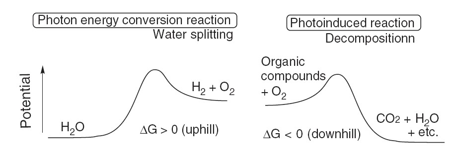 通常光催化反應(yīng)分為兩大類,上坡反應(yīng)和下坡反應(yīng),如圖1所示。上坡反應(yīng)(uphill)必須有光子提供能量才能進(jìn)行,如光催化分解水和植物的光合作用。下坡反應(yīng)(downhill)是能量釋放的過程,如光催化降解有機(jī)物。
