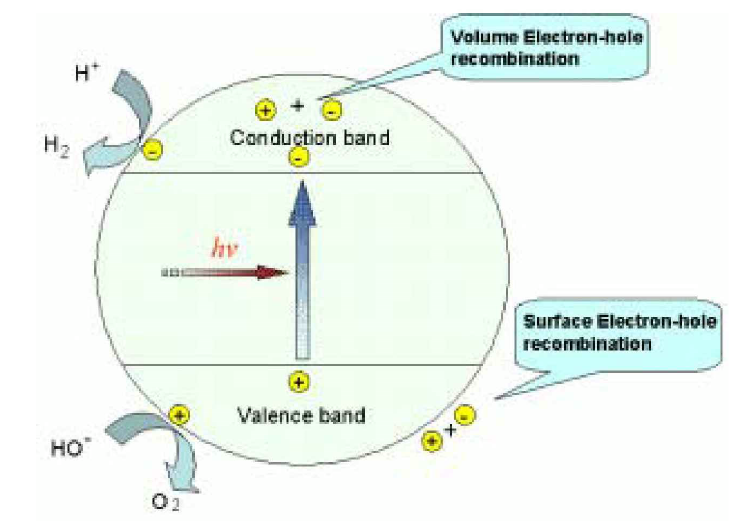 導(dǎo)帶的電子和價帶的空穴可以在很短時間內(nèi)在光催化劑內(nèi)部或表面復(fù)合,以熱或光的形式將能量釋放。因此加速電子—空穴對的分離,減少電子與空穴的復(fù)合,對提高光催化反應(yīng)的效率有很大的作用。