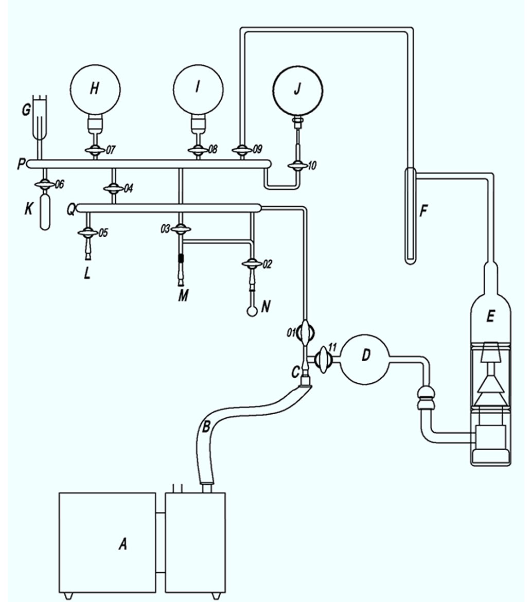 該系統(tǒng)包括由機(jī)械真空泵A,真空波紋管B,可伐KF接頭C,緩沖球D,組成一級真空泵,用于抽取低真空段,該部分真空可以抽取到1.0Pa;玻璃擴(kuò)散泵E,用于提升真空度,提升真空度到10-2-10-3Pa,此為二級真空泵,液氮冷阱F,用于冷卻系統(tǒng)中雜質(zhì)氣體,也有利于幫助提高真空度;真空規(guī)管G和精密真空表J,分別用于測量系統(tǒng)的高真空度及低真空度;玻璃球瓶H、I為儲氣瓶,用于儲存?zhèn)溆眉兓玫臍怏w;玻璃管P為高真空部,為工作玻璃管,為該系統(tǒng)的核心部分;玻璃管Q為低真空部,用于連接測試樣品池M,進(jìn)氣接口L,為工作管P服務(wù),并實(shí)現(xiàn)高低真空的轉(zhuǎn)換;玻璃制備瓶K,用于氣體的純化與制備;制備安瓶N,用于液體的純化與制備;該系統(tǒng)全部采用玻璃真空閥門,更好的保證了氣密性,02,03為三通玻璃真空閥門(詳圖2),01、04、05、06、07、08、09、10、11為二通玻璃真空閥門(詳圖3)。