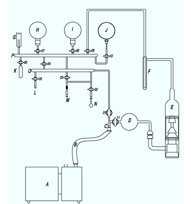 高真空系統(tǒng)由玻璃四級擴(kuò)散泵、真空泵、精密真空表、電離規(guī)、集氣瓶、球形安瓶、制備瓶、可伐、真空活塞等組成。該系統(tǒng)的高真空是通過一臺優(yōu)質(zhì)低噪聲的機(jī)械泵和一臺玻璃四級擴(kuò)散泵組成的機(jī)組而獲得。