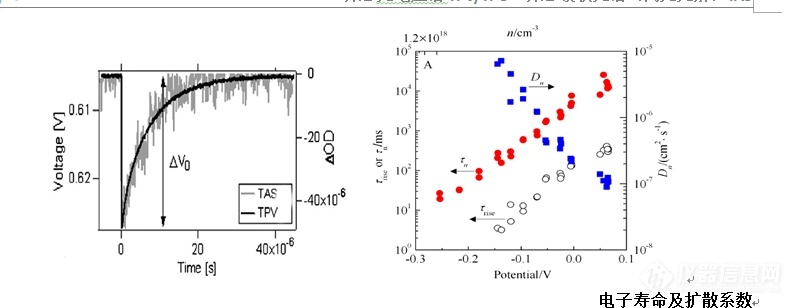 瞬態(tài)光電壓研究光生電子的傳輸行為,其光電壓響應(yīng)包括上升和衰退兩部分,光電壓上升部分在物理上對(duì)應(yīng)于TiO電極導(dǎo)電基底電子濃度增加(類似于電容充電過程),此過程由光生電子擴(kuò)散到達(dá)基底引起,光電壓下降部分主要對(duì)應(yīng)于電子離開導(dǎo)電基底的復(fù)合過程(類似于電容放電過程)。瞬態(tài)表面光電壓譜光生載流子動(dòng)力學(xué);瞬態(tài)光電壓研究光生電子的傳輸行為。