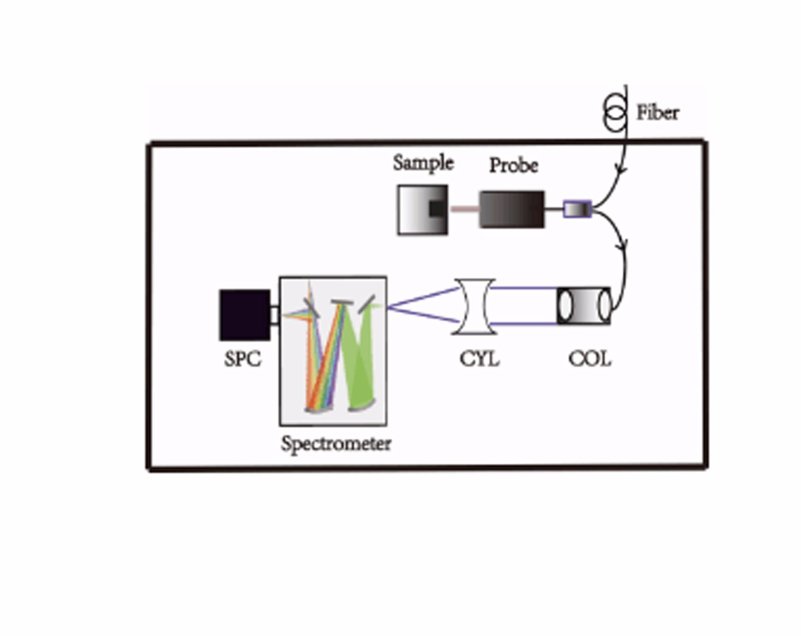 拉曼檢測(cè),激發(fā)樣品產(chǎn)生的拉曼信號(hào)通過(guò)探頭,探頭出射端連接光纖,光纖后端放置準(zhǔn)直器,以及柱透鏡對(duì)拉曼光斑整形。光路圖如下圖1.5所示。調(diào)節(jié)光斑使其聚焦到光譜儀狹縫。光譜儀采用全自動(dòng)光譜設(shè)備,內(nèi)部采用經(jīng)典的C-T不對(duì)稱(chēng)結(jié)構(gòu),且具有像差自動(dòng)校正功能。