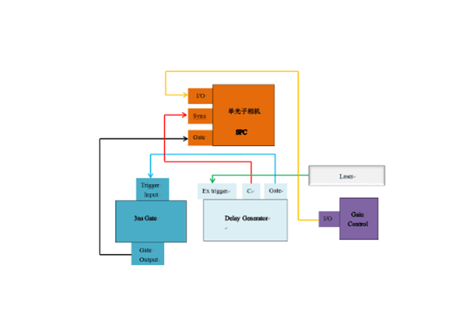 拉曼信號(hào)通過(guò)光譜儀分光到達(dá)單光子相機(jī)。該系列單光子相機(jī)主要包括:3ns Gate單元,Delay Generator單元,Gain Control單元,其連接示意圖如下圖1.6所示。Delay Generator單元接受激光器外觸發(fā),C端口接入單光子相機(jī)Sync端口,同時(shí)Gate端口接入3ns Gate單元的Trigger Input端口,由Gate Output端口輸出到單光子相機(jī)Gate端,且Gain Control 單元I/O端口接入單光子相機(jī)I/O端口。各單元模塊的作用是可精準(zhǔn)開(kāi)啟單光子相機(jī)內(nèi)部各個(gè)部件,達(dá)到時(shí)序同步一致。