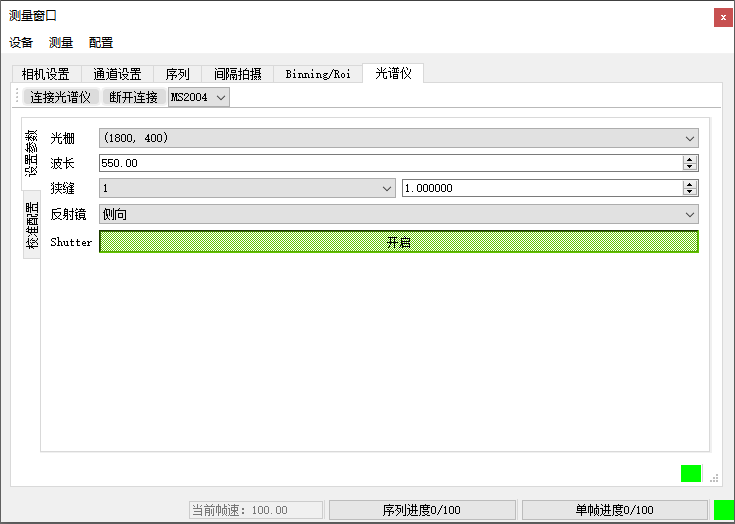 打開(kāi)<光譜儀>選項(xiàng),,點(diǎn)擊連接光譜儀,光譜儀選擇MS2004,參數(shù)設(shè)置如下圖3.14所示。點(diǎn)擊Shutter開(kāi)啟。