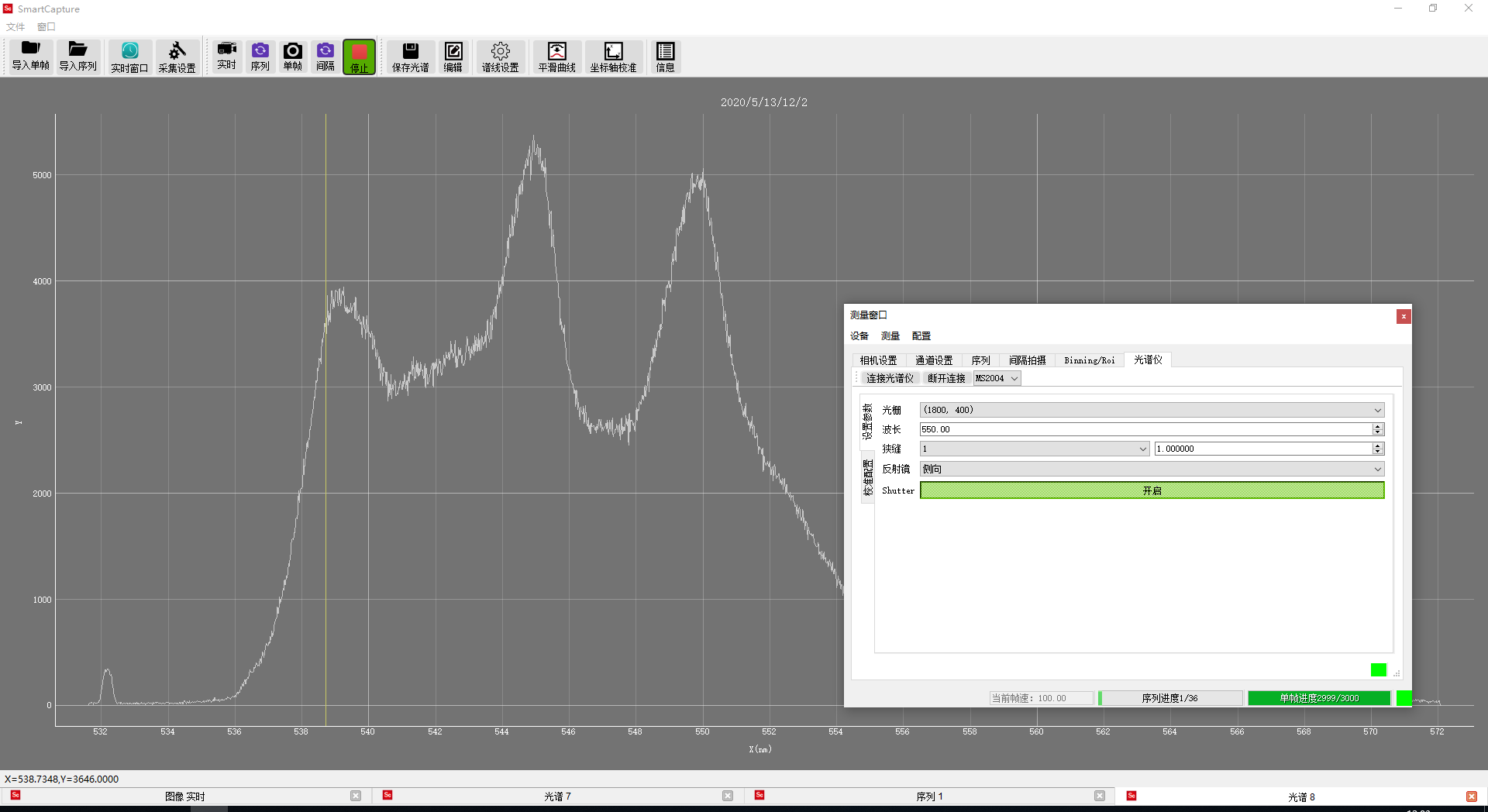 參數(shù)設(shè)置好,點(diǎn)擊標(biāo)題欄的<單幀>按鈕,軟件出現(xiàn)單幀采集界面,如下圖3.15所示。單幀模式適合單次測(cè)量,實(shí)時(shí)觀察樣品信號(hào)。
